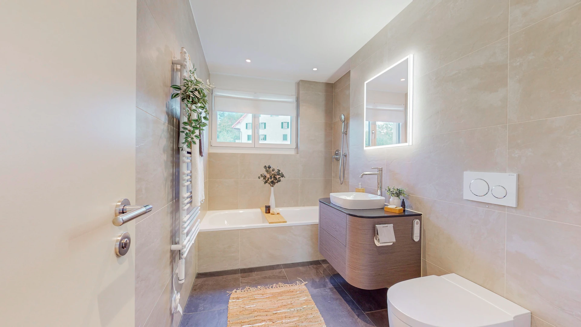 Ein stilvolles Familienbad mit Tageslicht, ausgestattet mit Badewanne, Lavabo und Toilette, rundet das Obergeschoss auf elegante Weise ab.