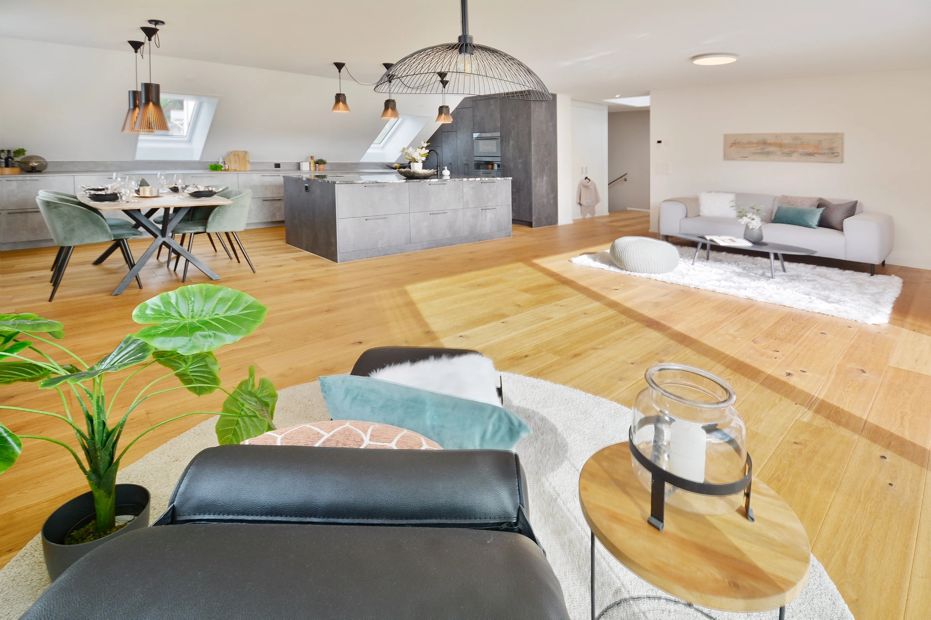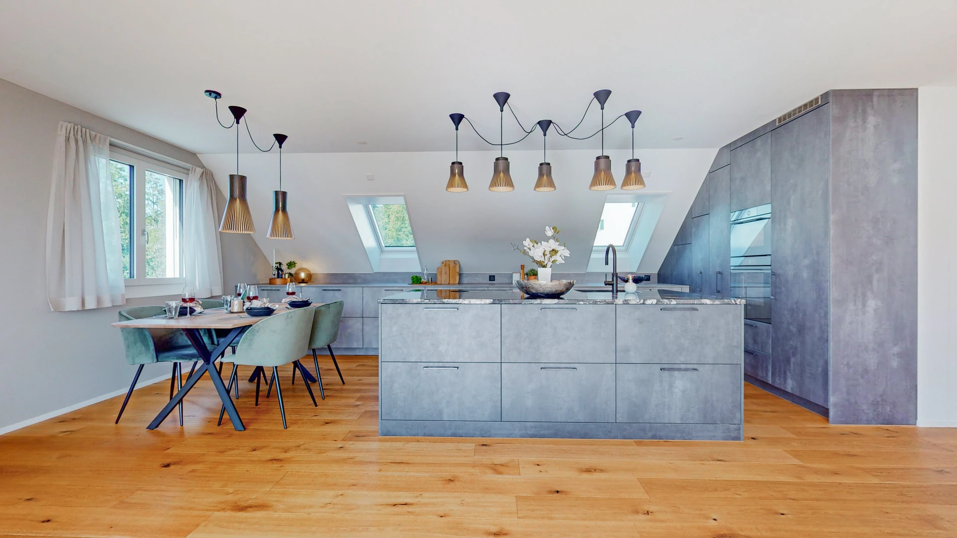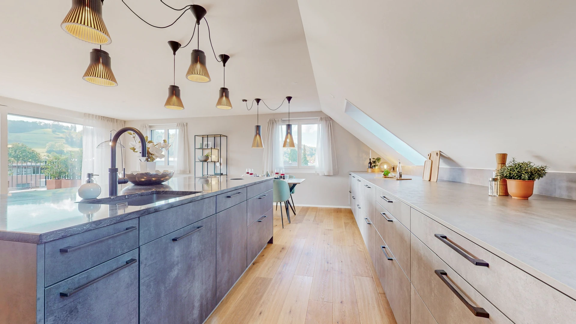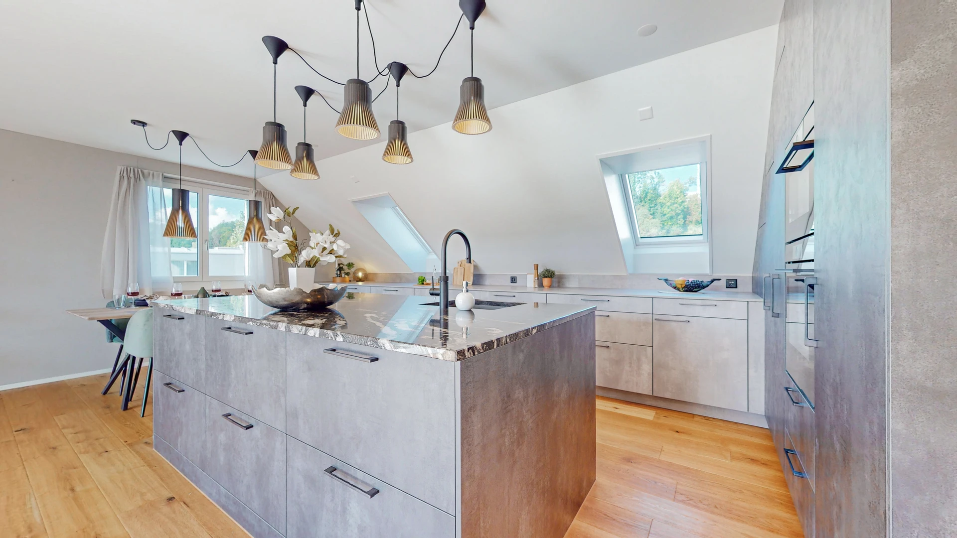 Die elegante, offen gestaltete Küche mit ihrer zentralen Kochinsel lädt zu kulinarischen Abenteuern ein und verbindet stilvolles Design mit funktionaler Perfektion. Die kurzen Wege und die offene Gestaltung lassen Kochen und Geselligkeit zu einem Erlebnis werden, das den Alltag verschönert.