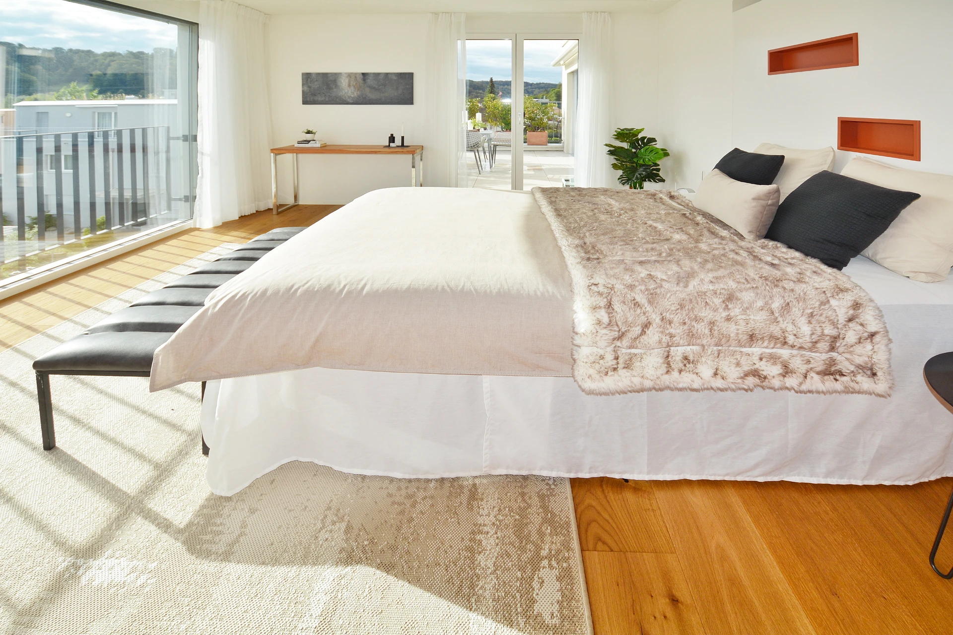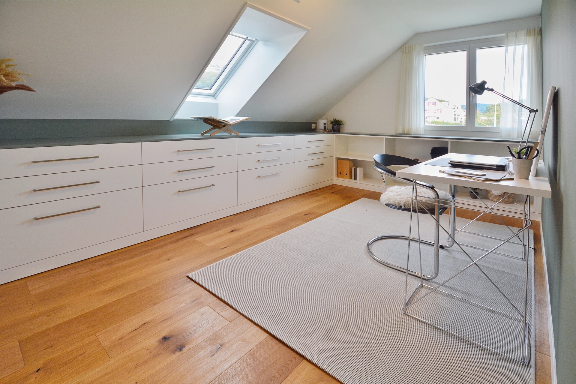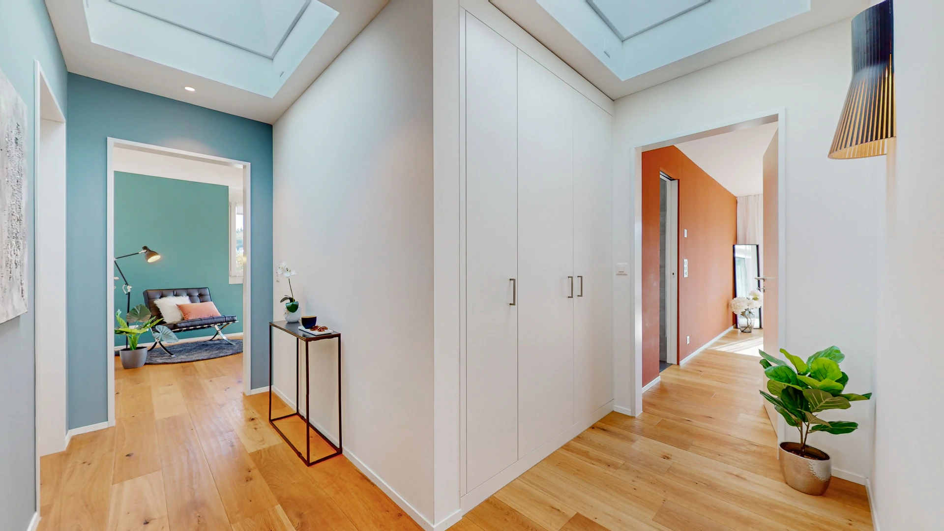 Im Obergeschoss finden sich die privaten Rückzugsorte, die sich um eine lichtdurchflutete Diele mit Oberlicht anordnen. Die drei Schlafzimmer bieten mit ihrem luftigen Ambiente und den optimalen Lichtverhältnissen eine Atmosphäre, in der man sich sofort wohlfühlt. Der grosszügige Masterbedroom besticht nicht nur durch ein modernes En-suite-Bad, sondern auch durch den direkten Zugang zur weitläufigen, sonnigen Terrasse– ein perfekter Ort, um den Tag in völliger Entspannung ausklingen zu lassen.