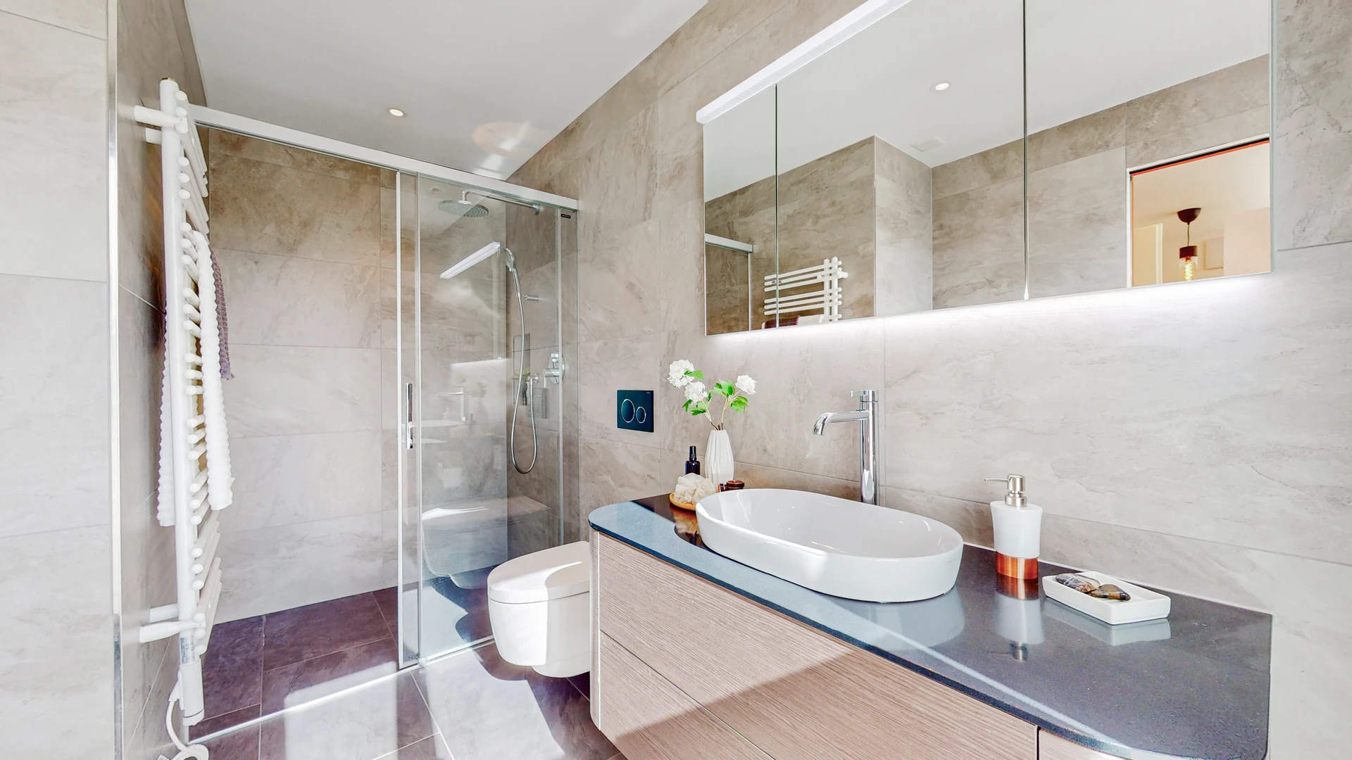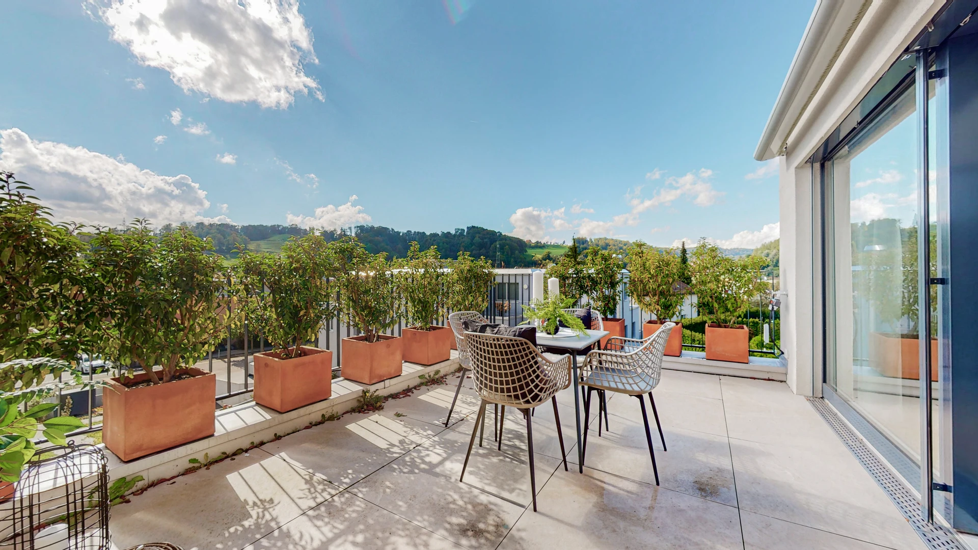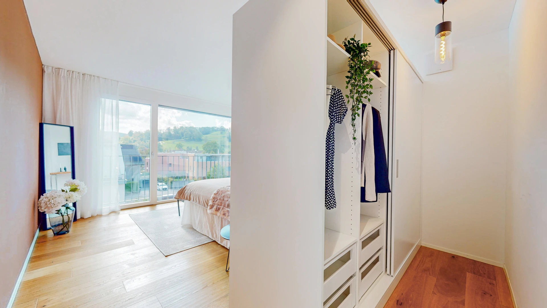 Im Obergeschoss finden sich die privaten Rückzugsorte, die sich um eine lichtdurchflutete Diele mit Oberlicht anordnen. Die drei Schlafzimmer bieten mit ihrem luftigen Ambiente und den optimalen Lichtverhältnissen eine Atmosphäre, in der man sich sofort wohlfühlt. Der grosszügige Masterbedroom besticht nicht nur durch ein modernes En-suite-Bad, sondern auch durch den direkten Zugang zur weitläufigen, sonnigen Terrasse– ein perfekter Ort, um den Tag in völliger Entspannung ausklingen zu lassen.