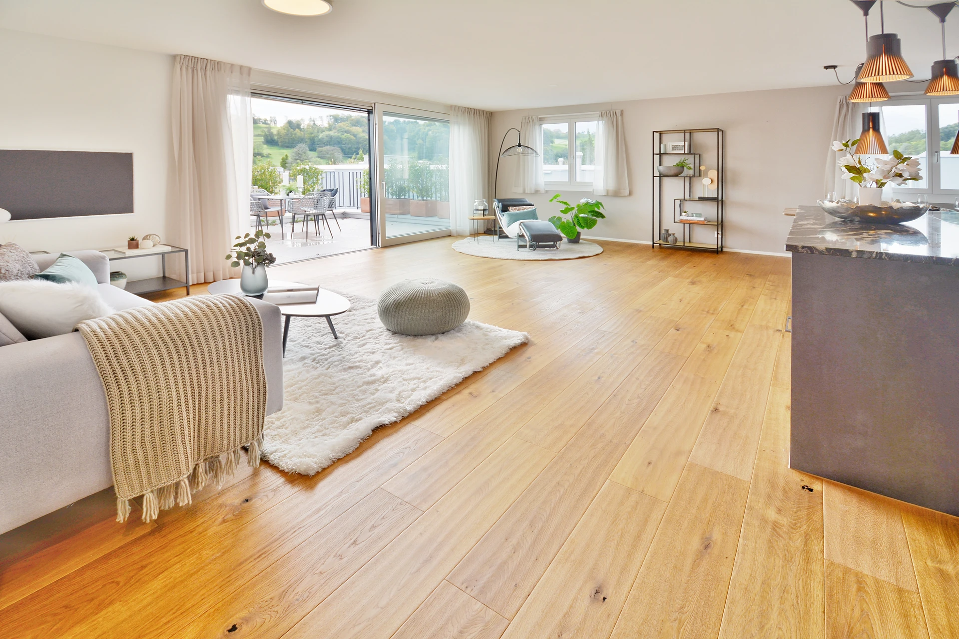 Das wahre Highlight erwartet Sie im weitläufigen Wohn- und Essbereich – dem pulsierenden Herz dieses Hauses. Helle Wände, geschmackvoller dunkler Parkettboden und beeindruckende Fensterfronten schaffen eine Atmosphäre, die sich sowohl einladend als auch luxuriös anfühlt. Die nahtlose Verbindung zwischen Innenraum und dem herrlich grünen Garten bringt die Natur direkt ins Haus und verleiht jedem Tag ein Gefühl von Erholung und Geborgenheit. Der Außenbereich verführt mit üppiger Vegetation, einem windgeschützten Sitzplatz und lauschigen Nischen – eine wahre Wohlfühloase, die Ihnen Privatsphäre und eine atemberaubende, unverbaubare Aussicht über das Tal schenkt. Genießen Sie die Ruhe, während Sie den Sonnenuntergang von einer der Rasenflächen aus betrachten, oder gelangen Sie über eine Außentreppe zum erhöhten Gartenbereich, der ebenso beeindruckend ist.