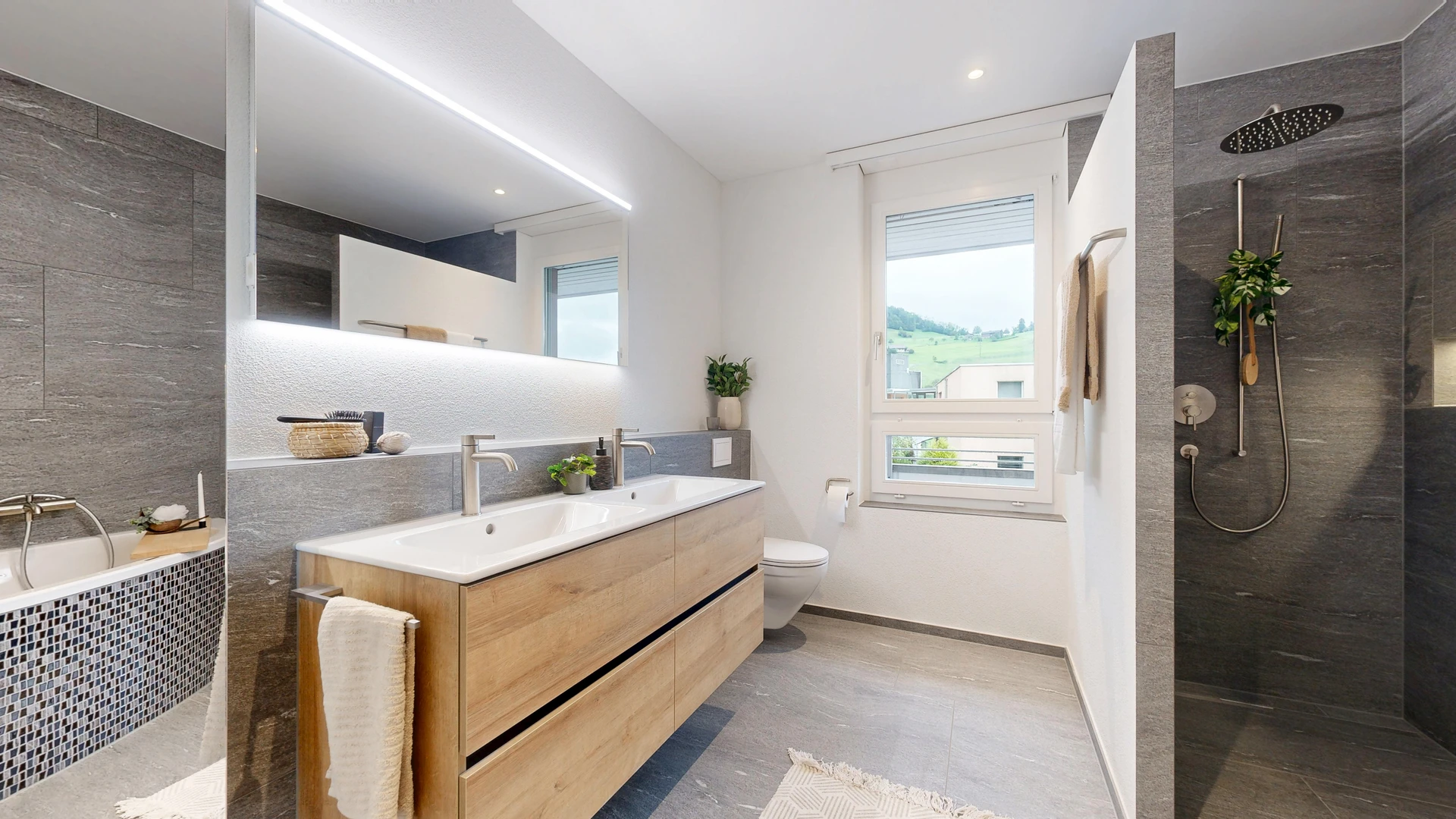 Vom Wohnbereich führt ein Korridor zu den Privaträumlichkeiten. Hier sind vier Zimmer, alle mit direktem Terrassenzugang und herrlichem Ausblick angeordnet. Der Master-Bedroom verfügt über eine eigene Ankleide und ein luxuriöses Bad en suite mit Eckbadewanne, Regendusche und Doppelwaschtisch. Zwei weitere Nasszonen sowie ein separates Gäste-WC ergänzen das hohe Komfortniveau. Alle Nassräume präsentieren sich in einem einheitlichem Design, das durch eine gekonnte Kombination von grossflächigen Fliesen in natürlichen Grautönen, Holzmöbeln und weissen Wänden begeistert.