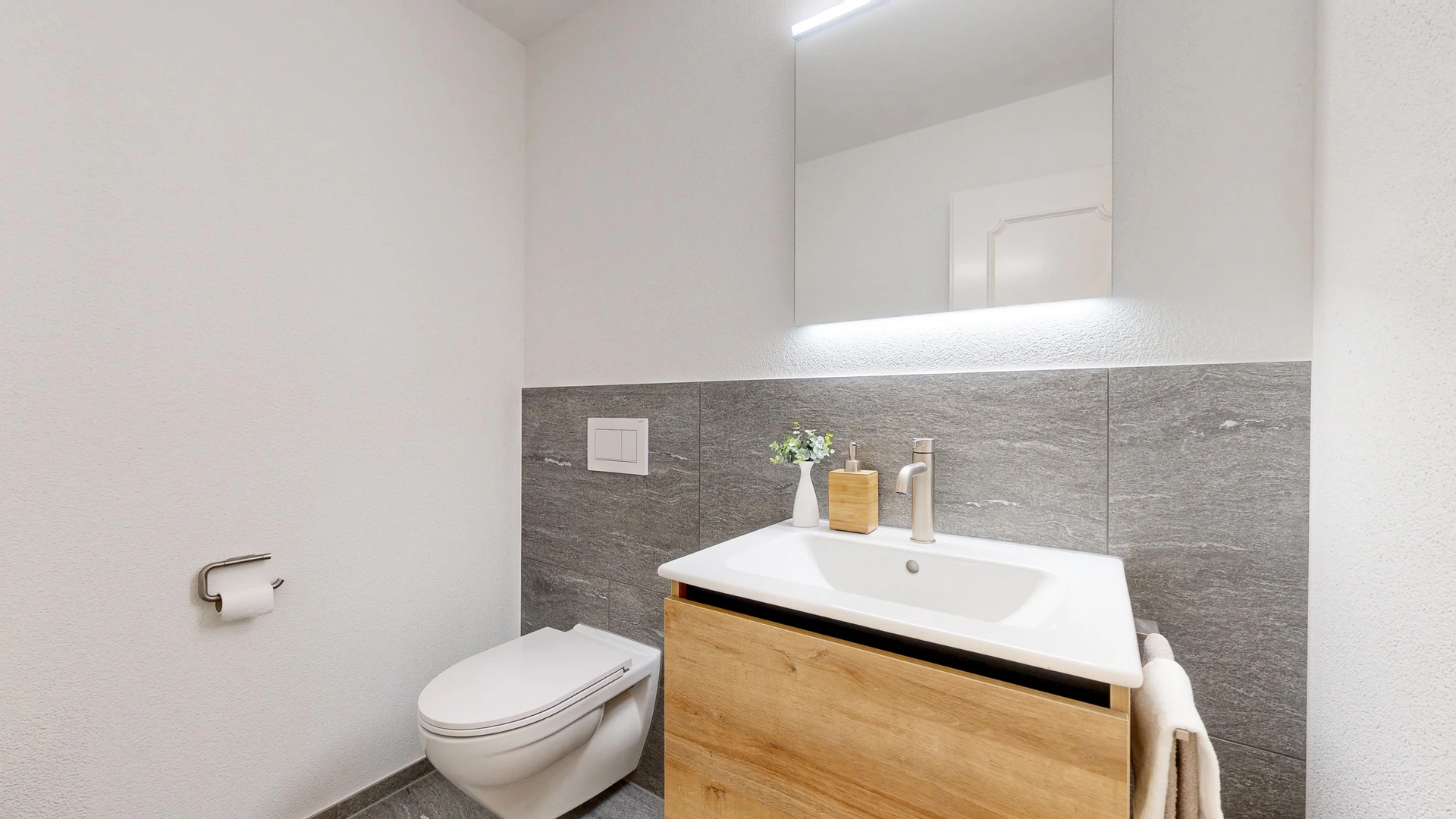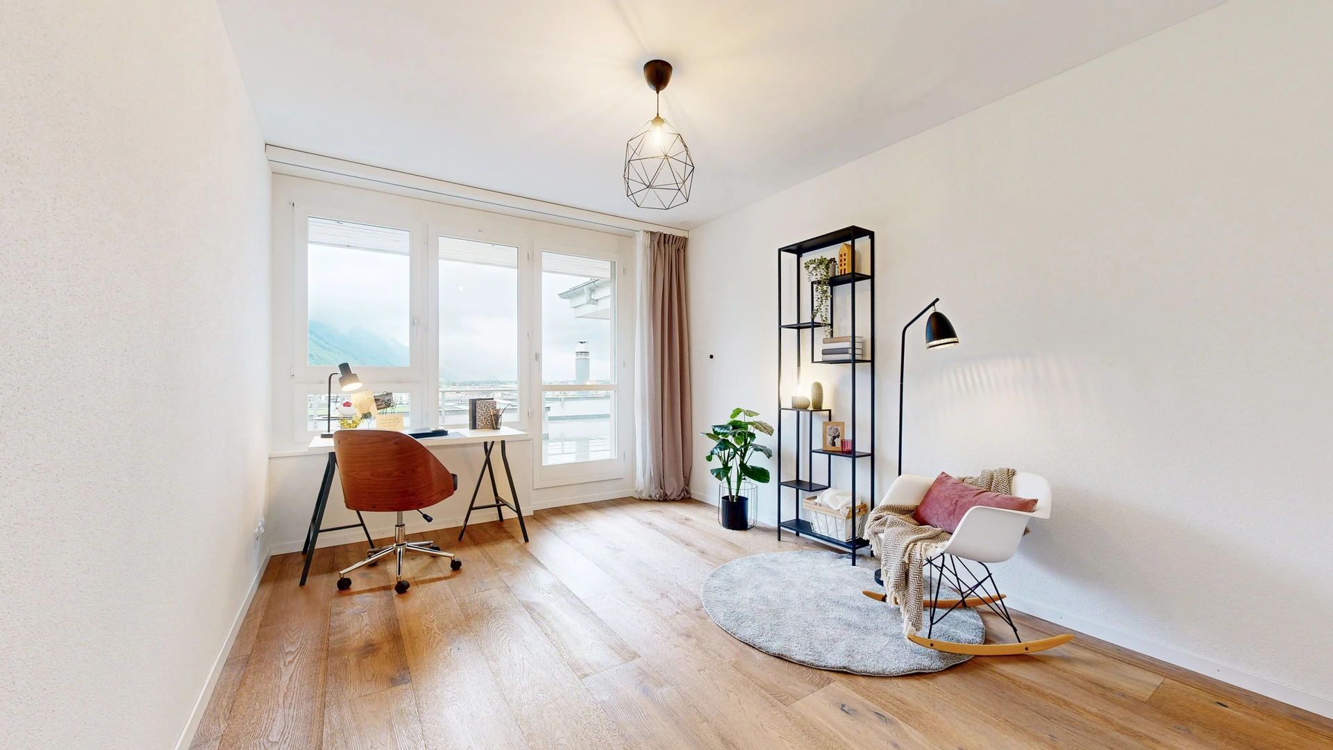 Über eine elektrisch gesteuerte Bodentreppe gelangt man vom Flur aus ins Obergeschoss, wo sich die Räume harmonisch um einen zentralen Vorraum herum gruppieren. Zwei geräumige, klimatisierte Mehrzweckräume bieten ideale Voraussetzungen für Homeoffice, ein Atelier oder Fitness. Der grosszügige Vorraum und der weitläufige Estrich vollenden das vielseitige Raumensemble.